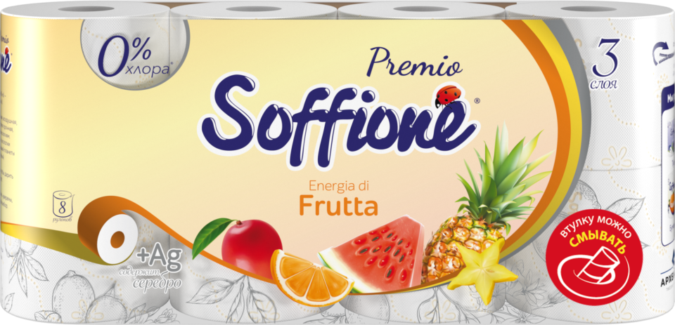 Трехслойная премиальная туалетная бумага с энергичным фруктовым ароматом и оранжевым цветом тиснения. С серебром.