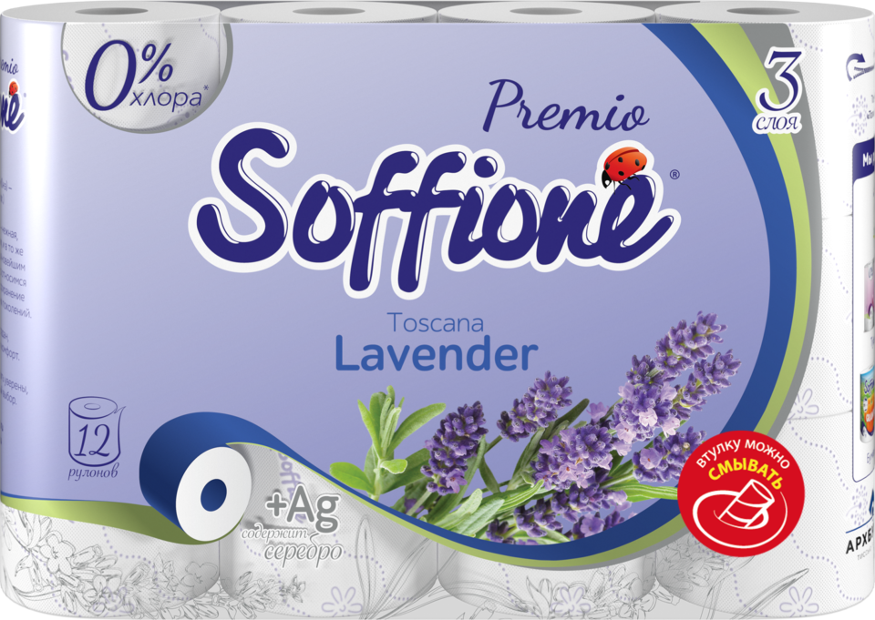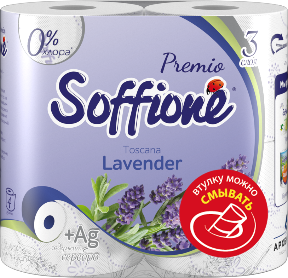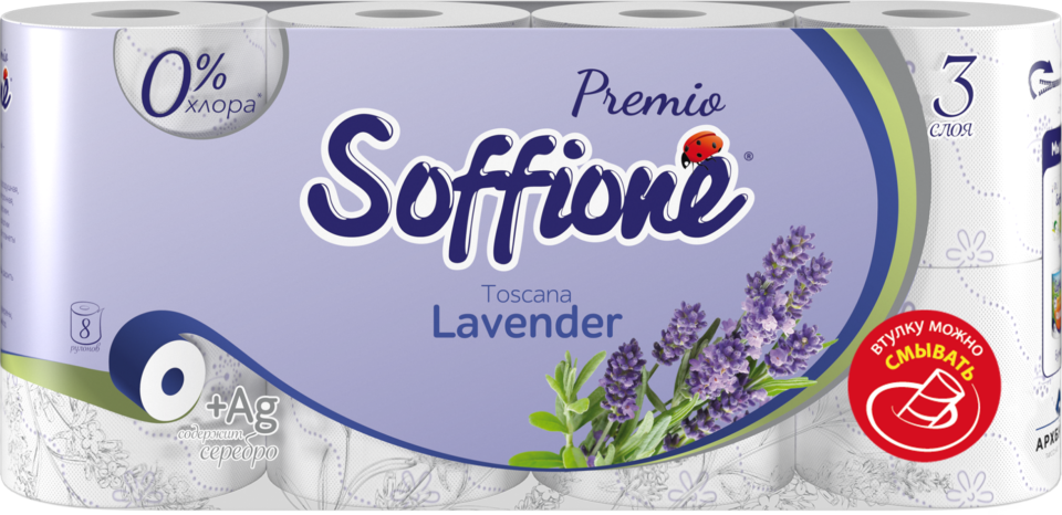 Трехслойная премиальная туалетная бумага с ненавязчивым ароматом лаванды и светло-фиолетовым оттенком тиснения. С серебром.